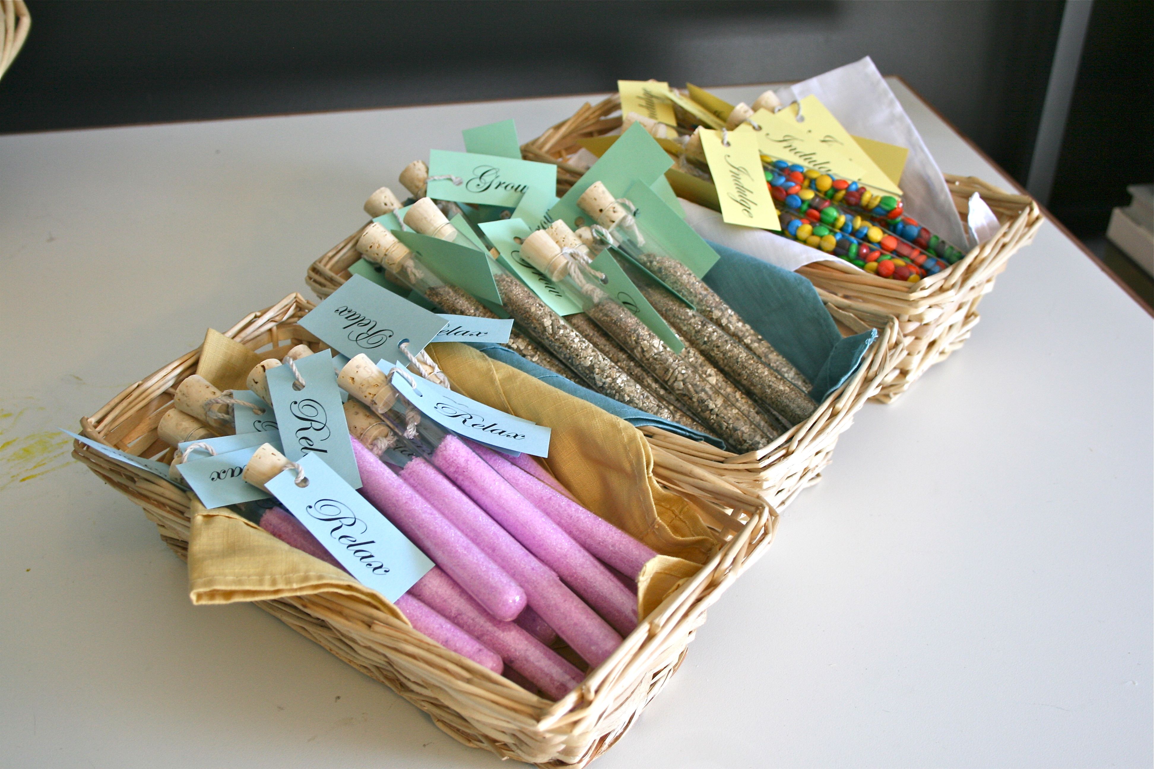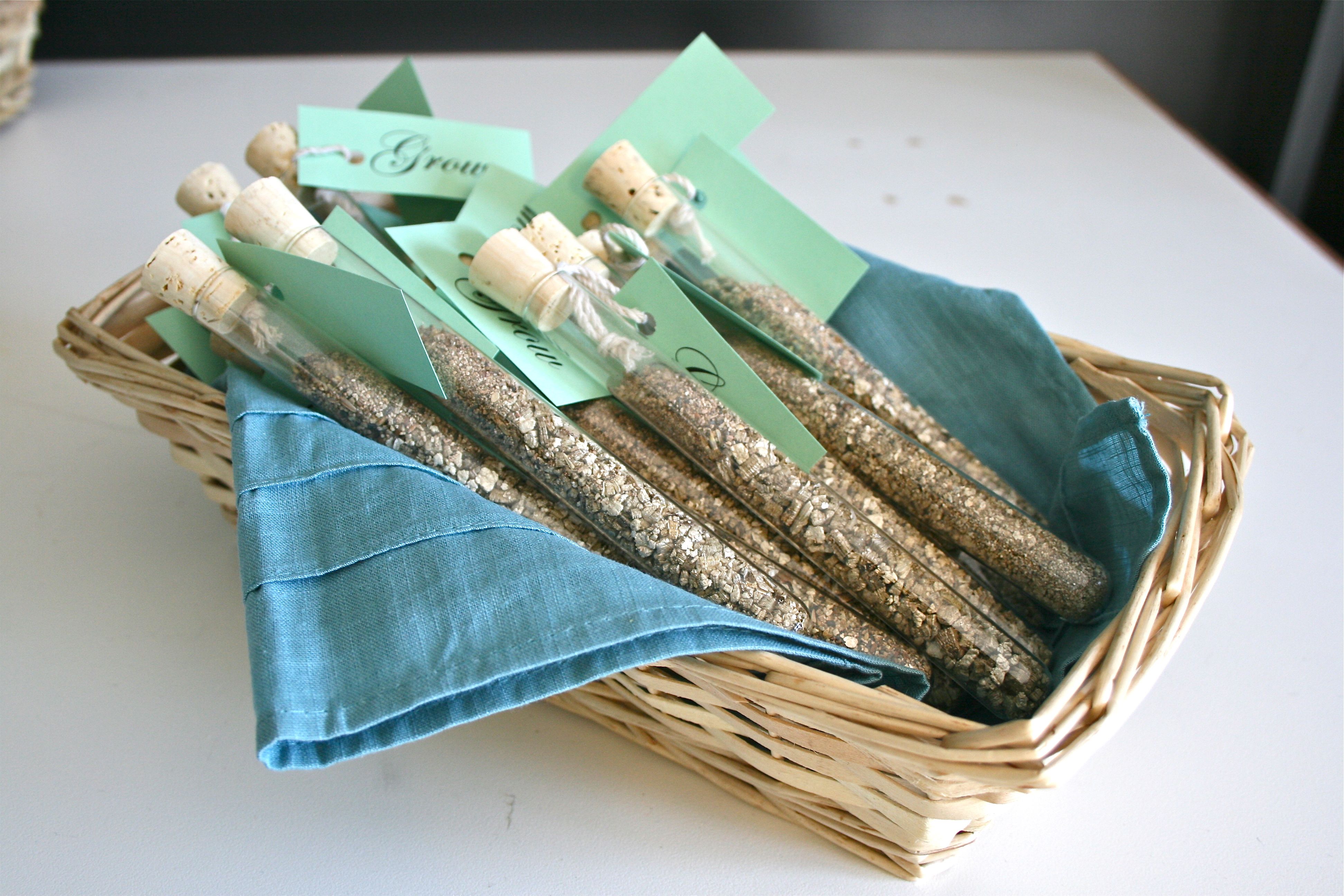 To make things easier on our guests, we (“we” being mom and I) decided to separate the three types of favors into individual baskets. We found these for 40% off at Michael’s craft store for only a few bucks apiece. They are long and thin, perfect for our long, thin test tubes. Plus, the natural wicker texture is pretty, simple and a nod to the vintage garden party theme that has emerged.