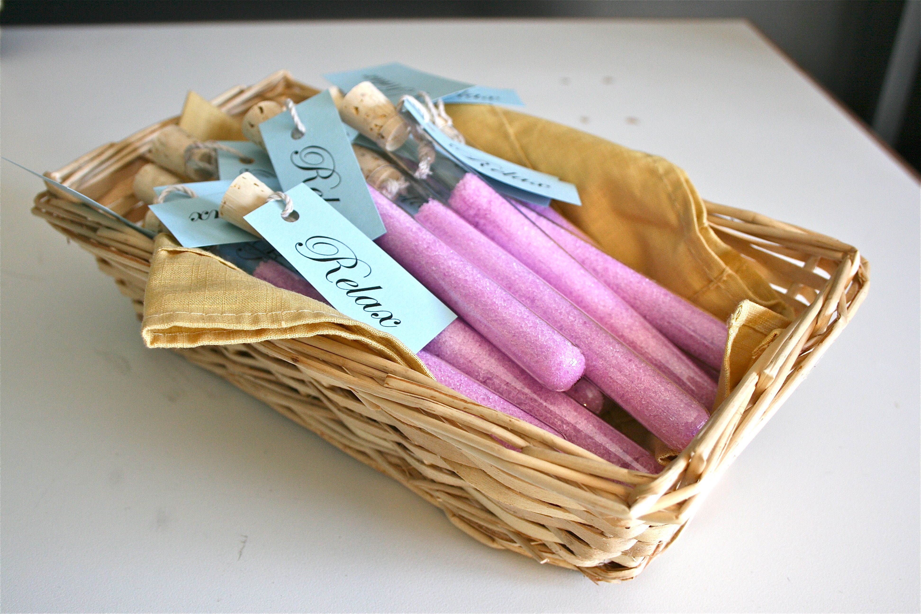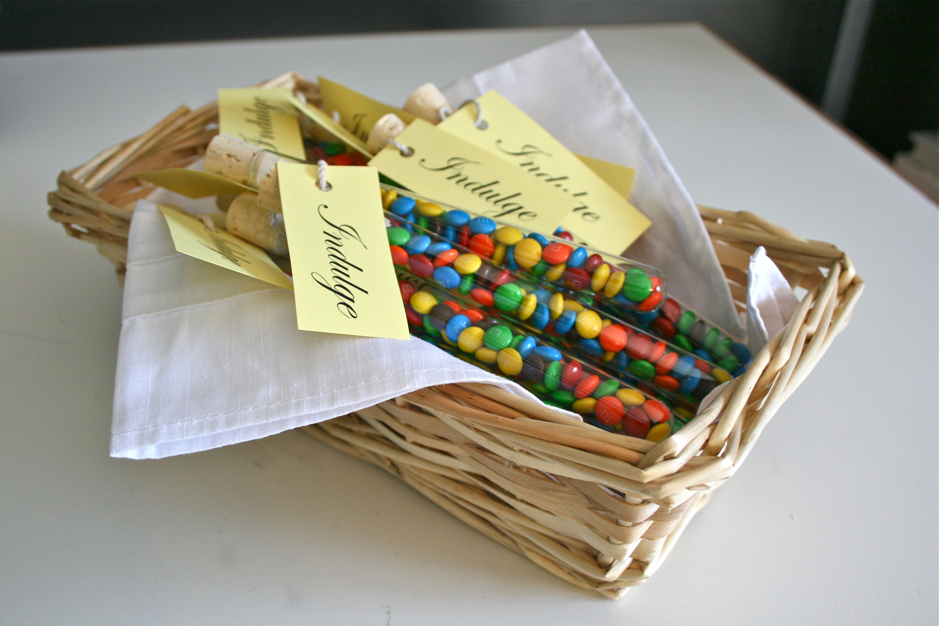 Soon enough, the supplies were acquired and the rest of the test tubes were filled to the brim and topped with a pretty natural cork. As you can see pictured below, the test tubes fill a large basket nicely, but they crowd each other so much that there would be a lot of digging to find the favor of choice.