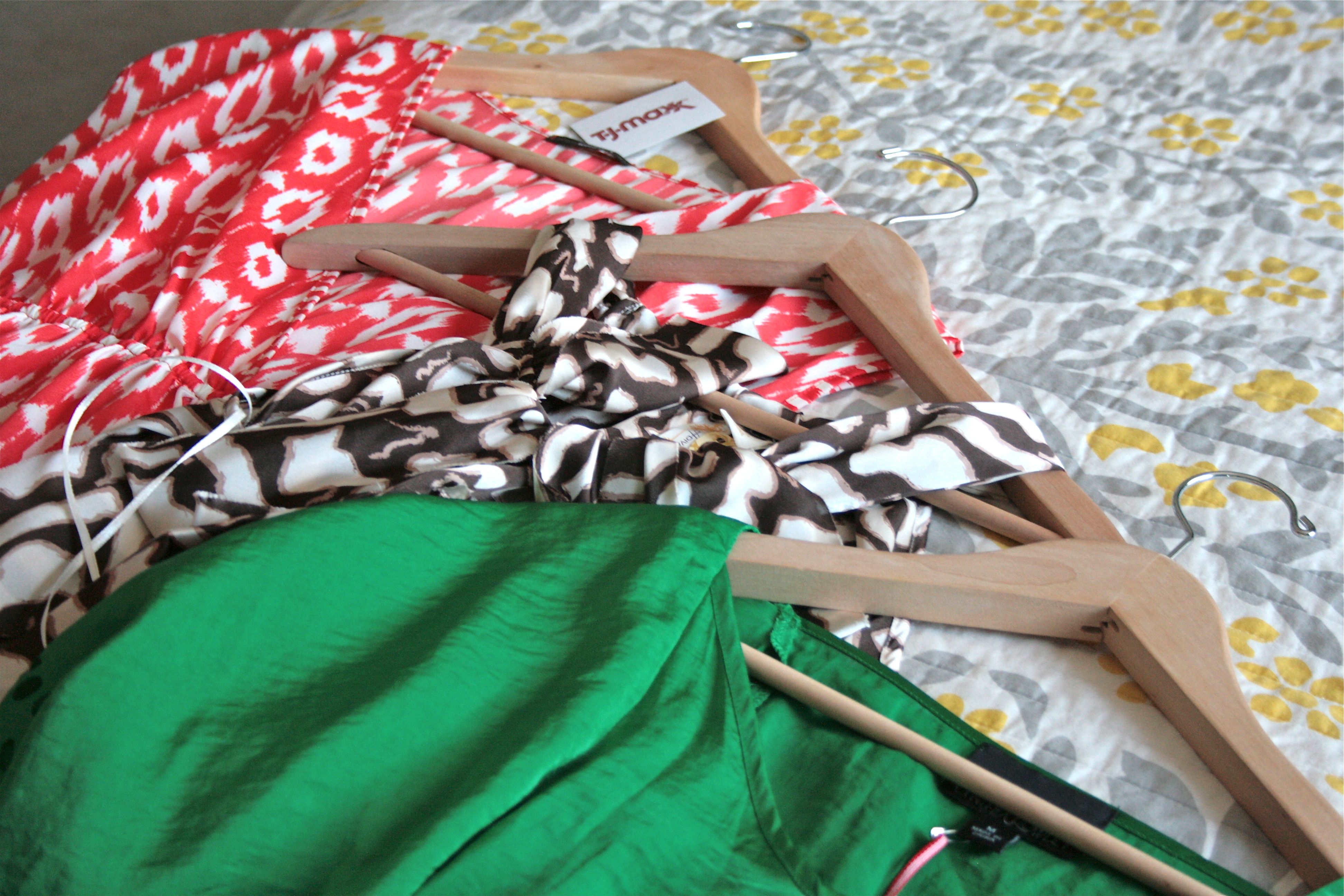 First things to get lovingly hung on their new boutique hangers? The three pieces I bought for myself at T.J. Maxx. I could already get the sense that the new wooden hangers made them feel straight out of a fancy designer clothing store – In my own home, no less! Exciting news for a girl like me…
