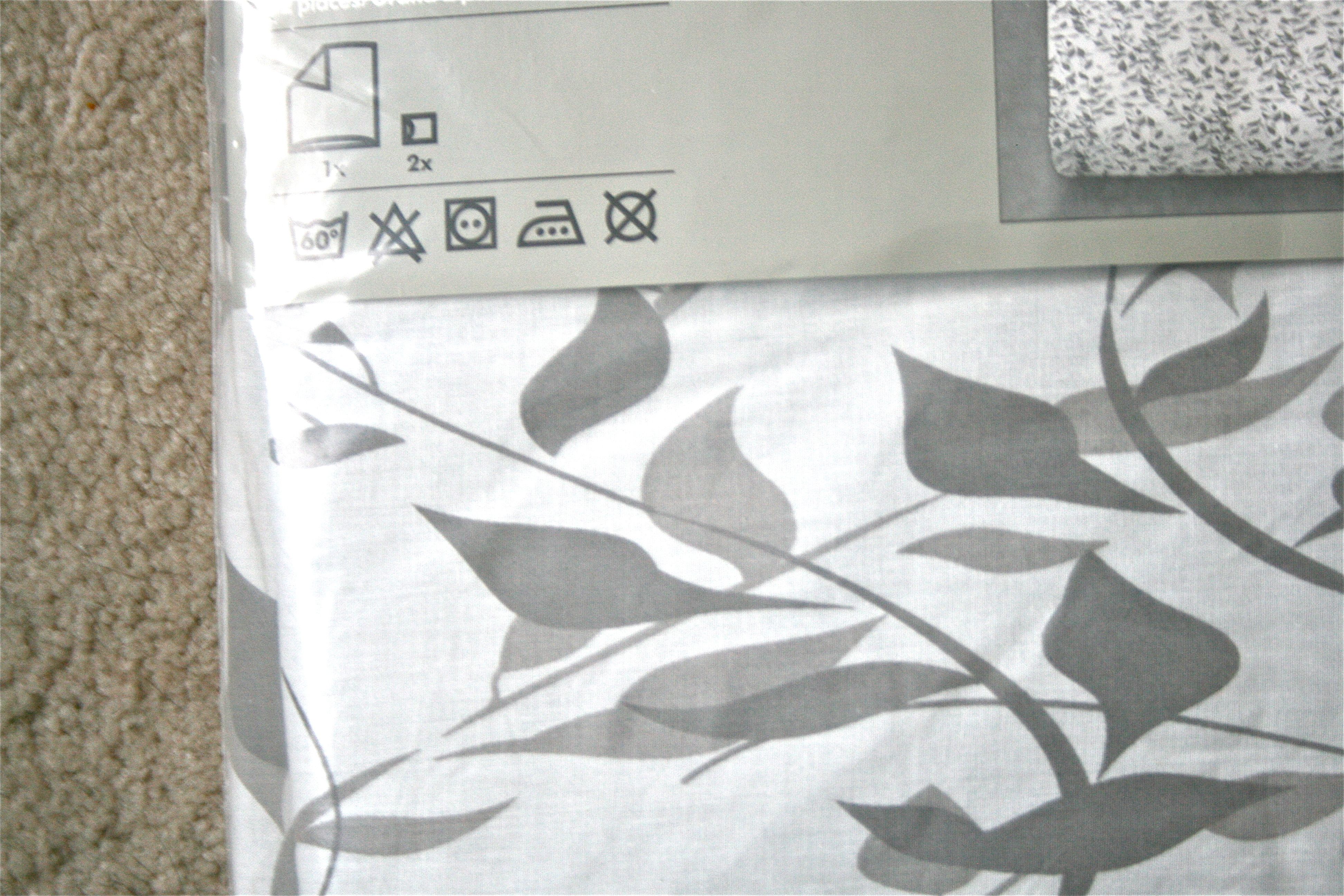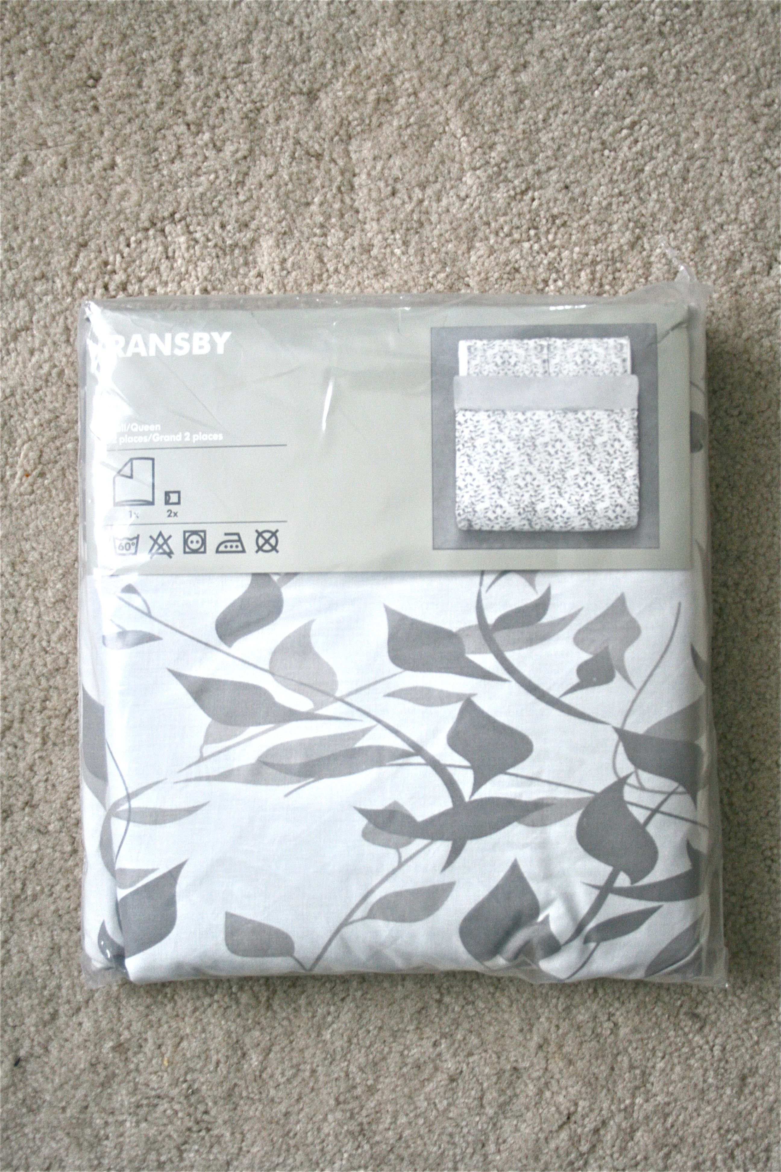 First, to find a replacement…After getting a soft and luxurious down comforter from our wedding gift registry, we decided to go with a duvet cover. It just so happened that we had scheduled a trip to Ikea right before jetting off to our honeymoon (there was one only minutes away from our airport), so I made sure to make a pit stop in their bedding section. There were so many to choose from, but we ended up going with Ransby, a subtle pattern of grey leaves and vines on a white background. For less than $30 for the set, it was too good (and pretty) a deal to pass up.