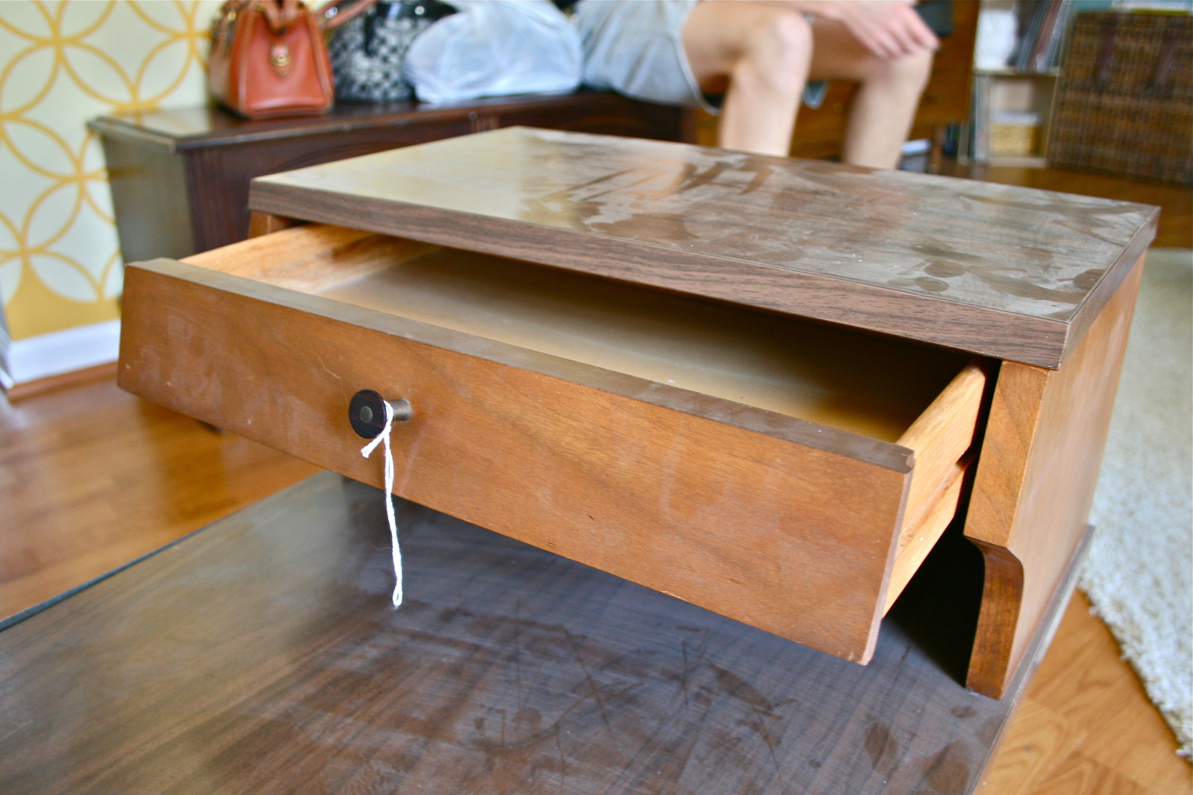 Yes, it’s a bit worse for wear between the piece of flapping vinyl off the side and the layers of dust and cobwebs, but the lines were right, the shape was right and even the hardware was right. I adore the simple look of the round drawer pull – A circle of dark wood surrounding a thin metal pin. It even had a drawer! We were made for each other…