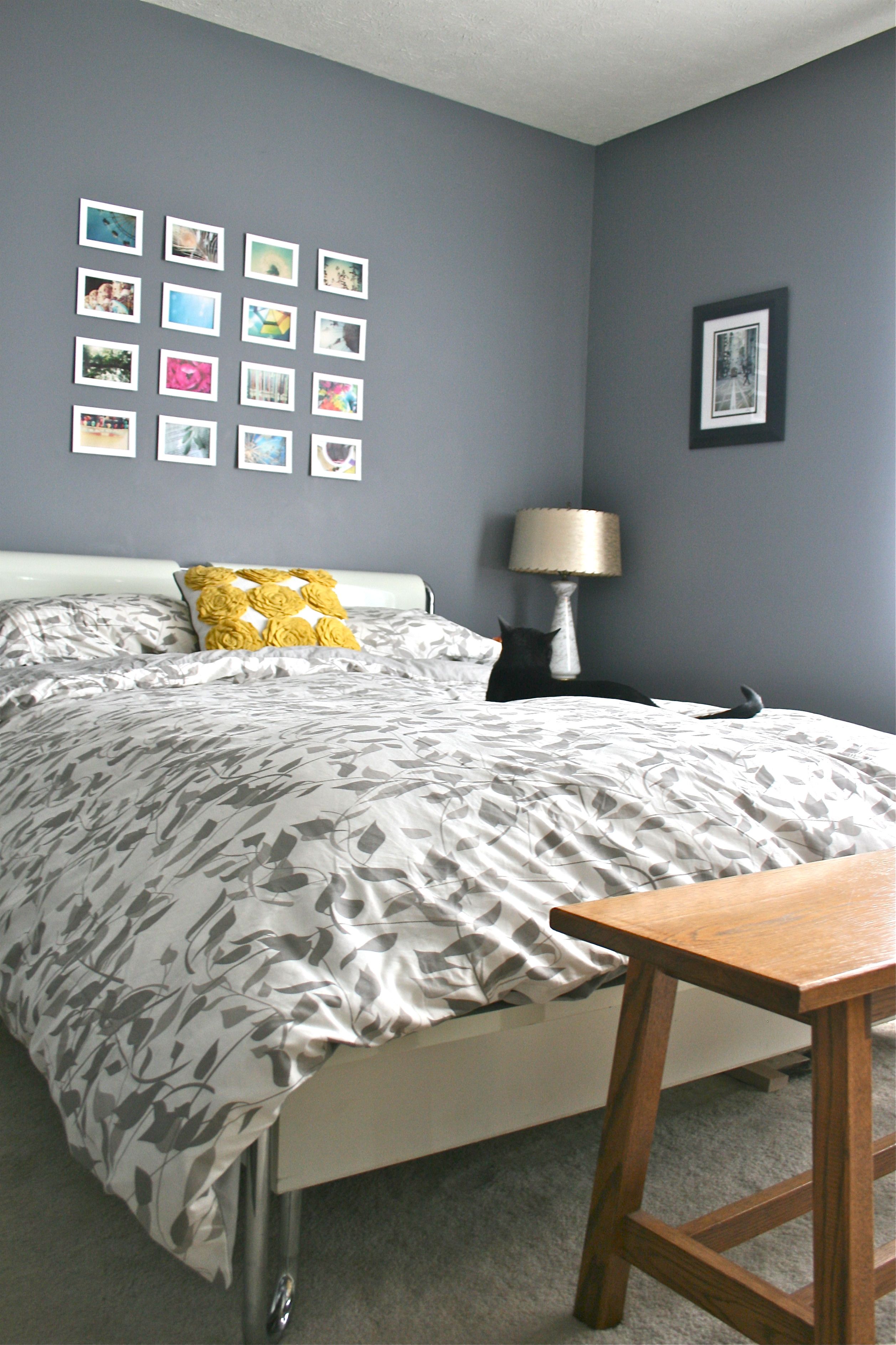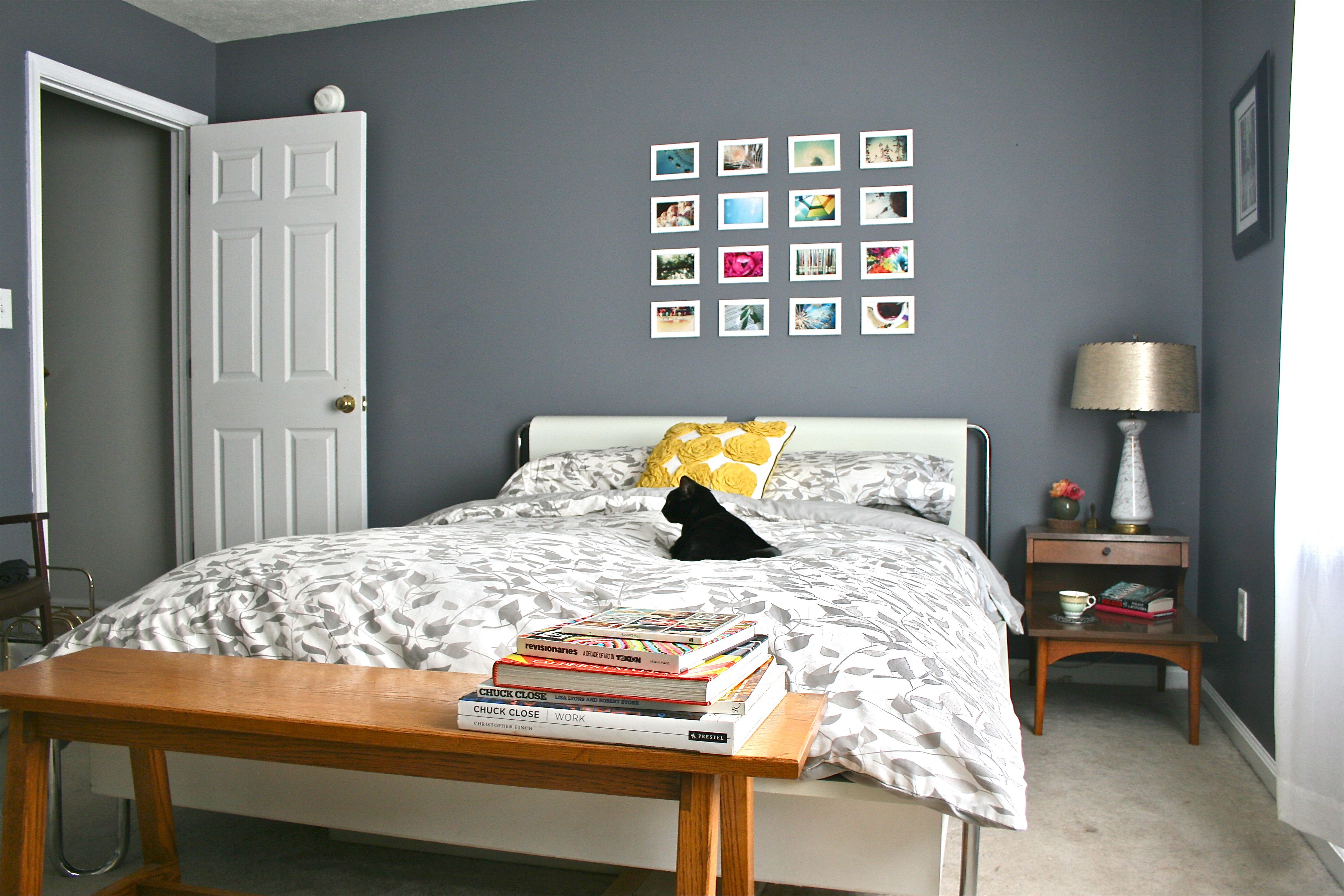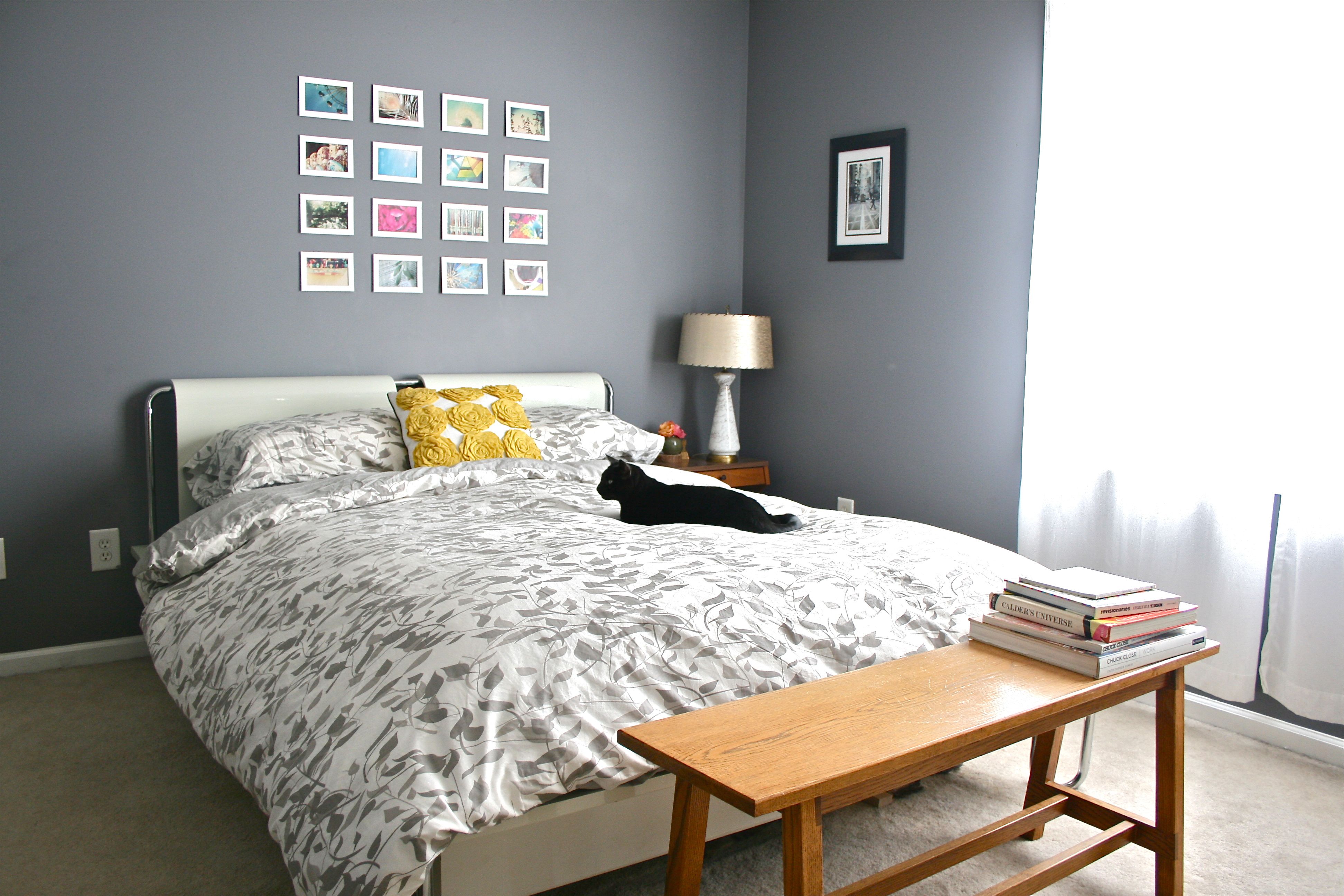 But about that OTHER new bed-side table…As you can see peeking around the bottom of the bed in the photo below, I also added a bench that my dad built. It used to live in the living room under the front window for the kitties (and sometimes the not-so-little dog) to people watch from, but since rearranging that room, it got displaced. I actually love it at the foot of the bed since it’s a great spot to stack excess pillows or slip on a pair of shoes in the morning.