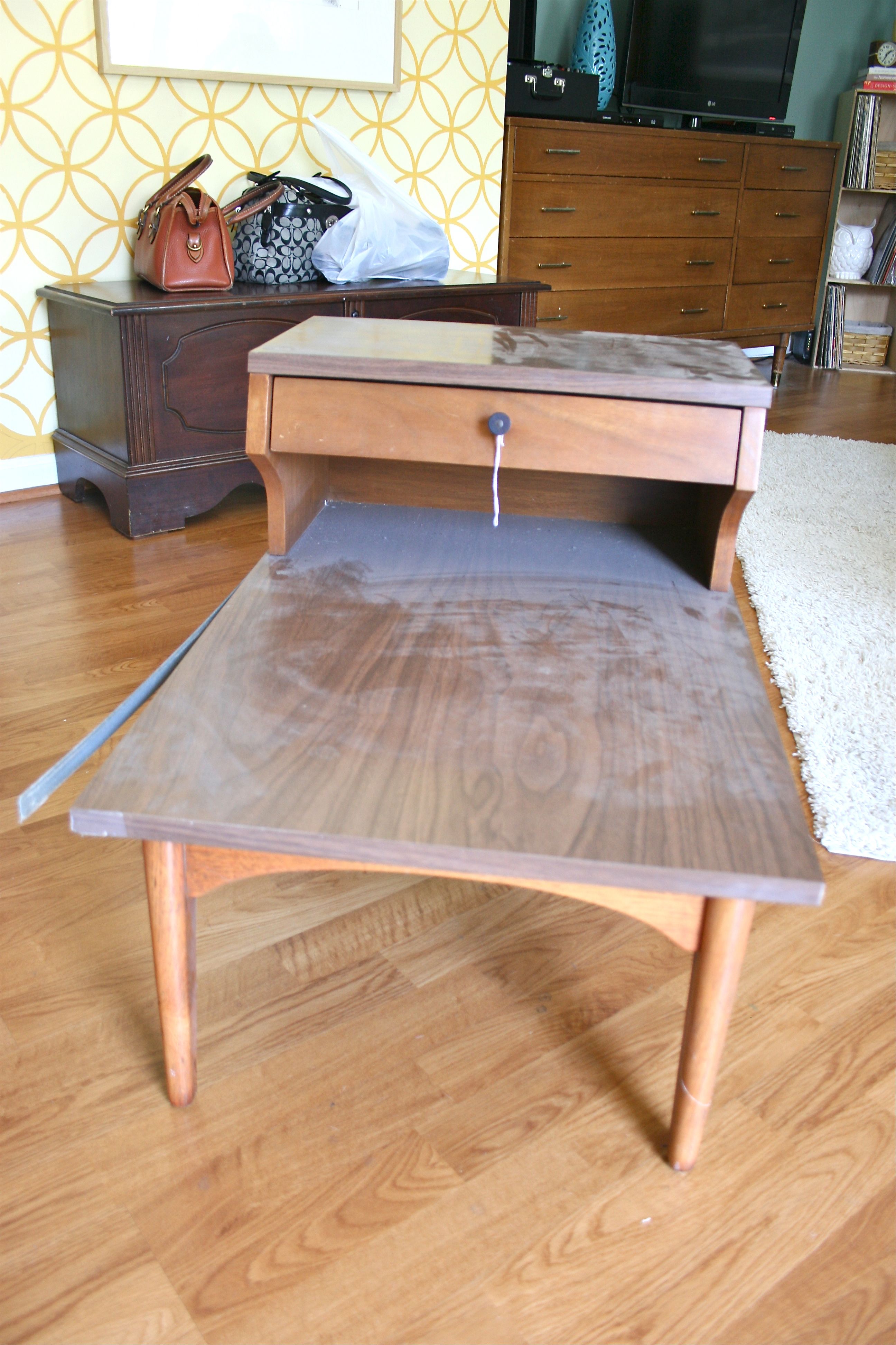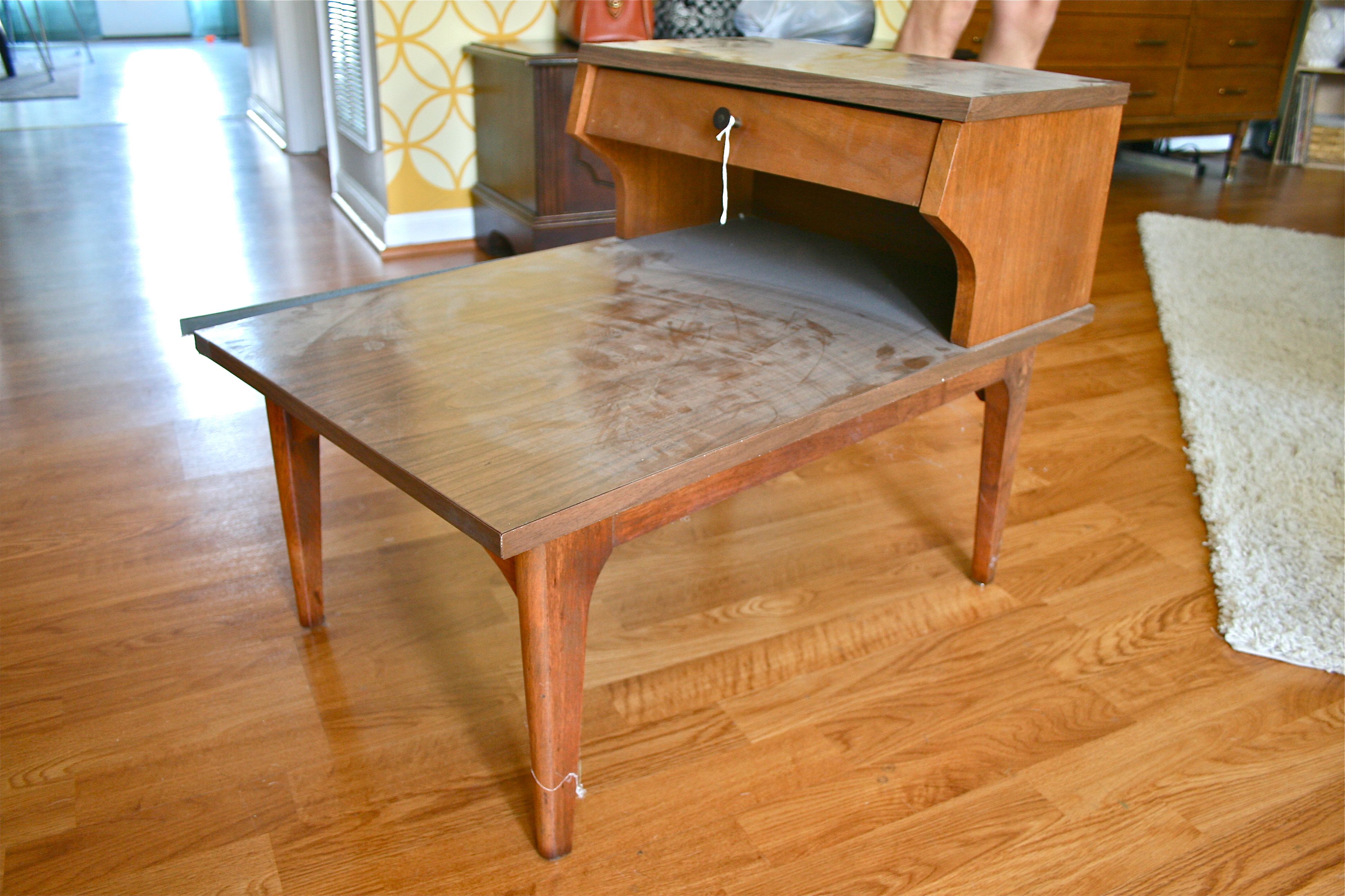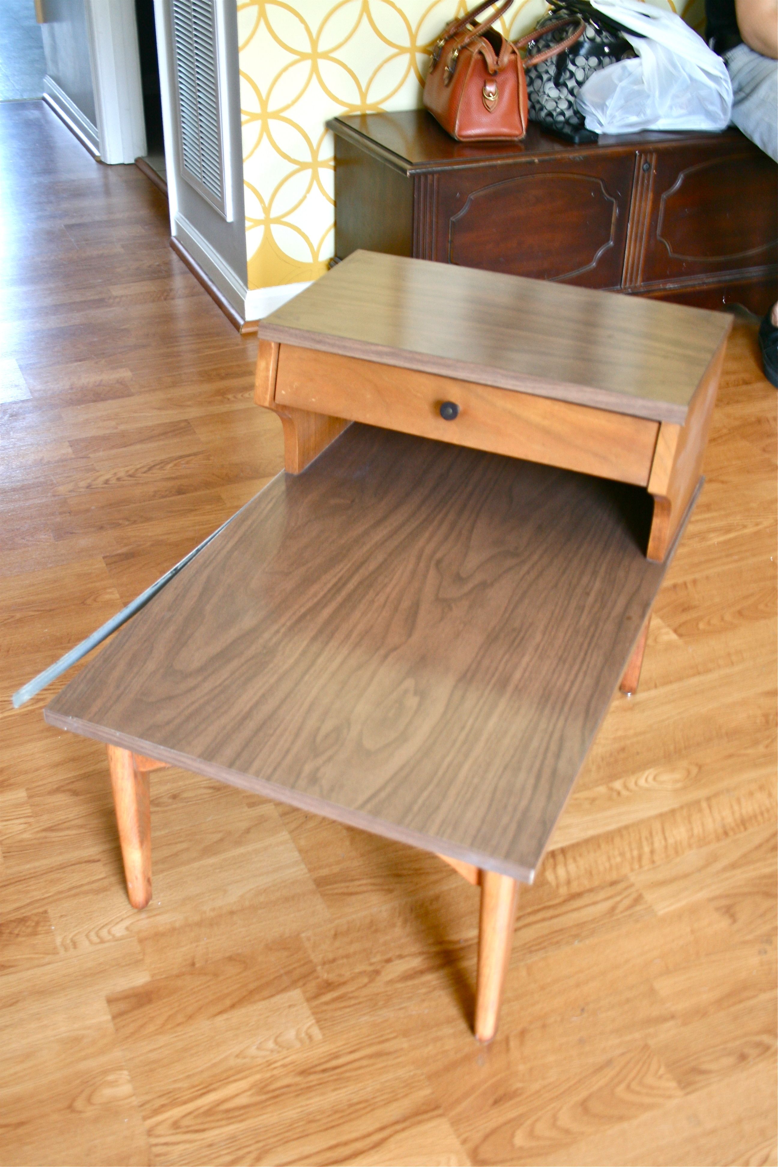 The reason I got rid of the original table was because of its traditional style – It was a perfect piece for me several years ago when I embraced the fully eclectic look (i.e. college era hand-me-downs), but now that I am working on a forever home and have the means to be picky with the furniture we add, I wanted to go with something I knew both John and I would love. What might that be? I envisioned something from the 1970’s with spindly legs, one of those two-tiered pieces with a drawer.