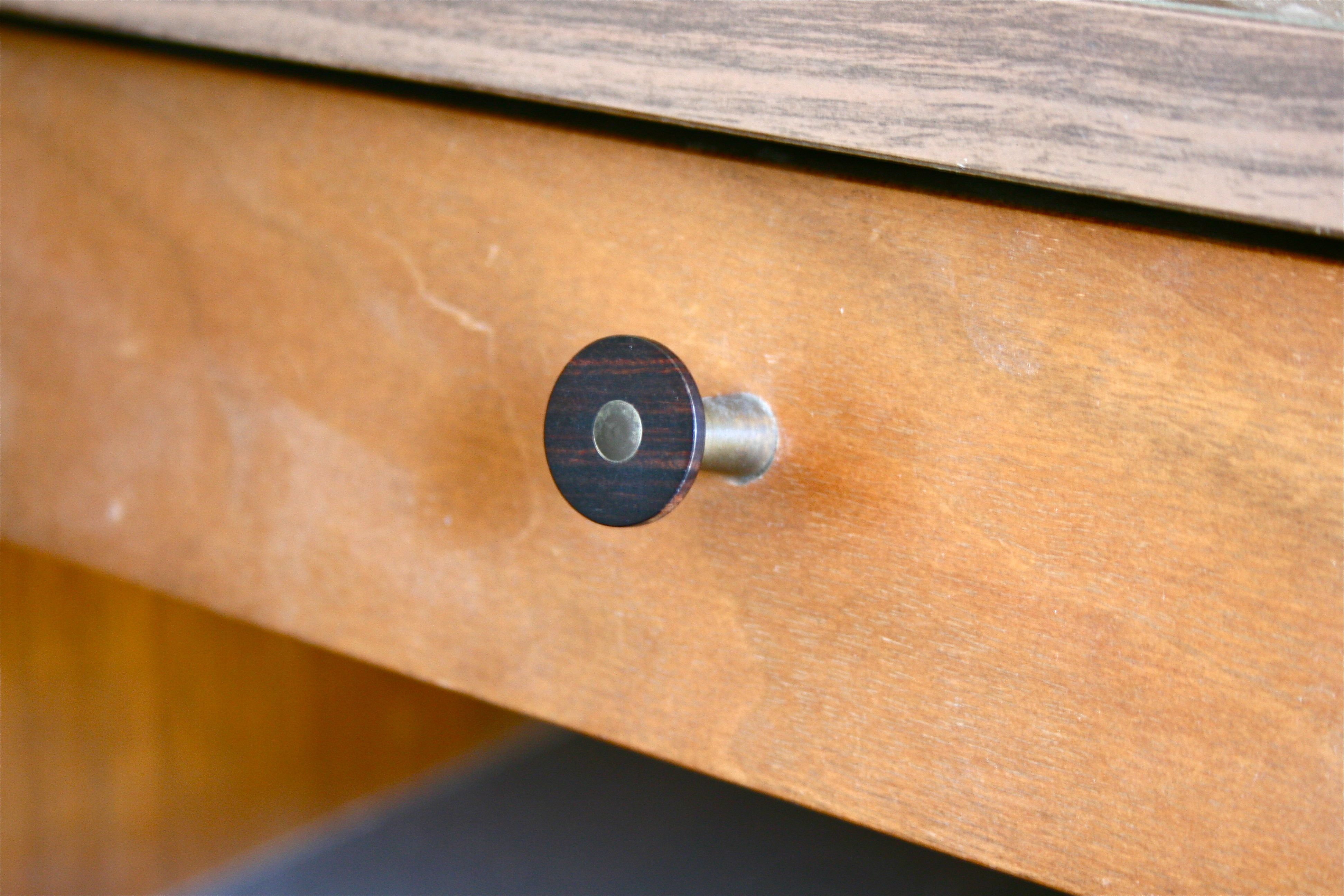 Yes, it’s a bit worse for wear between the piece of flapping vinyl off the side and the layers of dust and cobwebs, but the lines were right, the shape was right and even the hardware was right. I adore the simple look of the round drawer pull – A circle of dark wood surrounding a thin metal pin. It even had a drawer! We were made for each other…