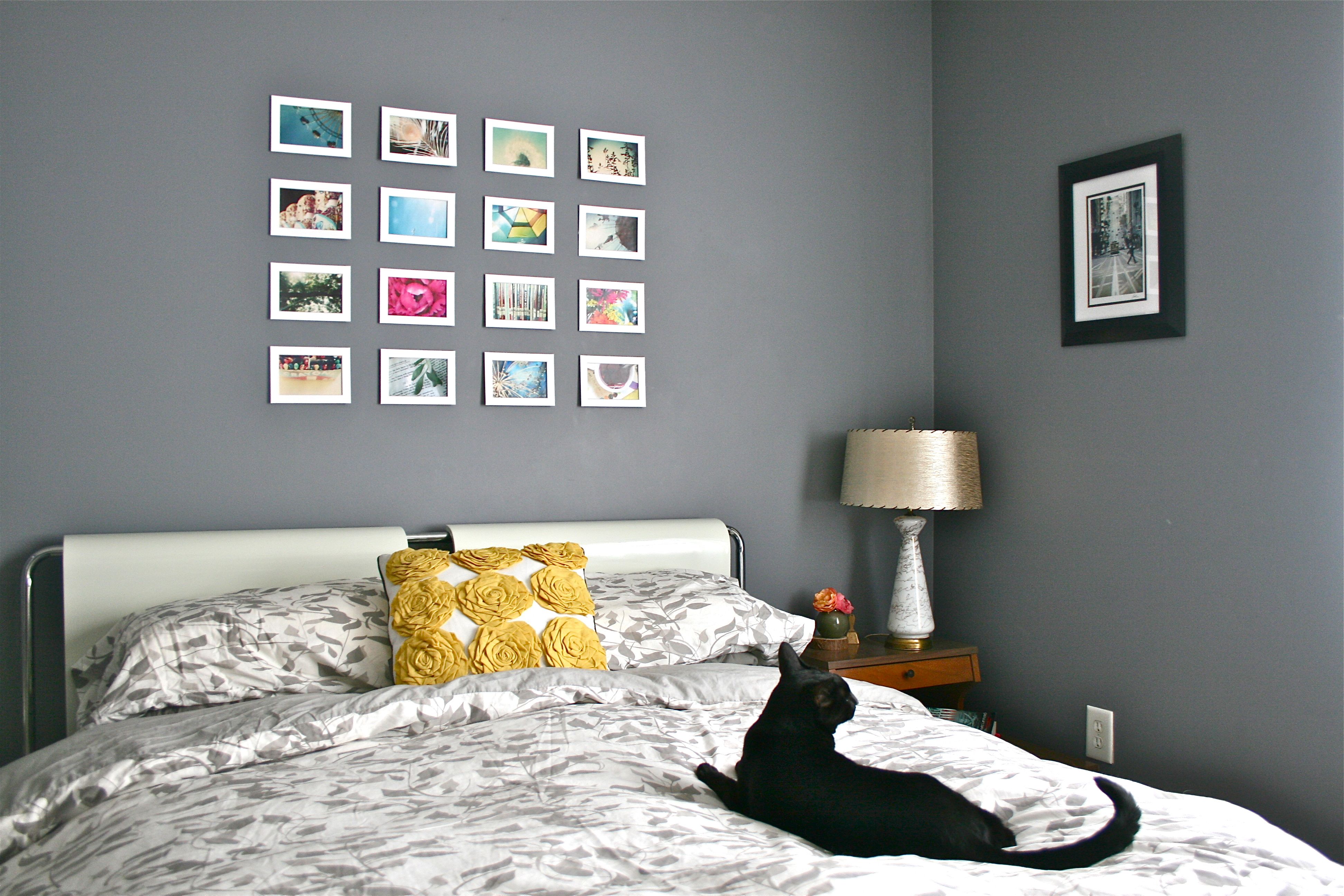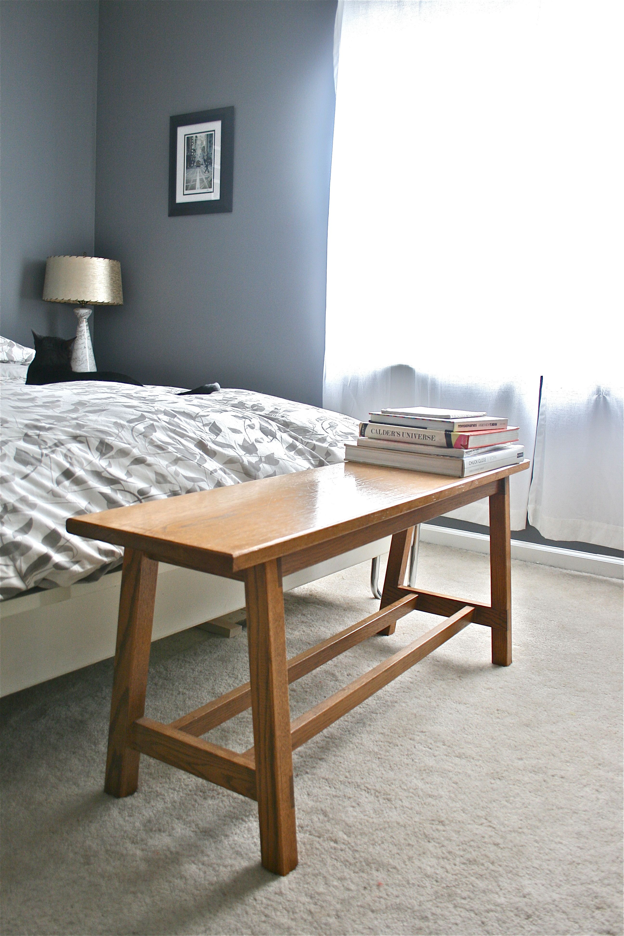But about that OTHER new bed-side table…As you can see peeking around the bottom of the bed in the photo below, I also added a bench that my dad built. It used to live in the living room under the front window for the kitties (and sometimes the not-so-little dog) to people watch from, but since rearranging that room, it got displaced. I actually love it at the foot of the bed since it’s a great spot to stack excess pillows or slip on a pair of shoes in the morning.