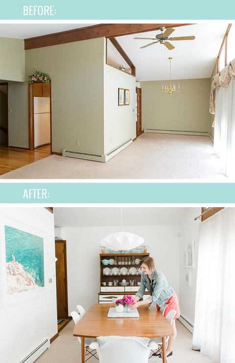The biggest update in the dining room was switching out the brass chandelier for a new mid-century inspired fixture. It instantly jazzed up the room, and I love that you can see it from the living room, too. Now to get that old ceiling fan changed out for a new white one…