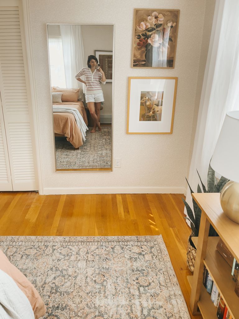 One rug that caught my attention in particular was the Aubrey – AUB-01 Area Rug from the partnership between Loloi and Angela Rose. You can see the rug pictured hanging in the Loloi showroom above, and today I’m showing you what that same rug looks like in a real life space—our guest room. I just knew that the soft blue and coral color palette was going to be perfect for our bonus bedroom, and the rug did not disappoint once I had it unrolled under the bed frame. I love how the dusty, intentionally faded colors look alongside the vintage wallpaper in our guest room, and the peachy pink linens that I chose for the bed are the perfect complement to those tones in the rug, too.